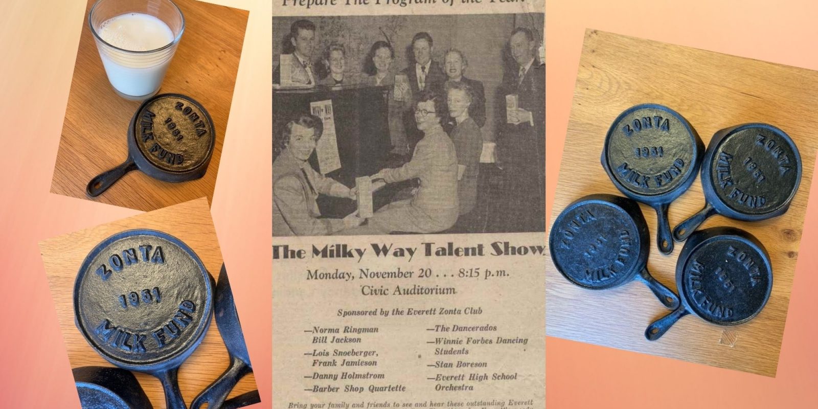 February 4, 2021Blog, ServiceCindyP During the 1950’s Zonta Clubs across the USA participated in the Milk Fund campaign to provide milk to needy children. The Everett club recently received these cast iron pans that were used in 1951 to collect monies for the campaign.
