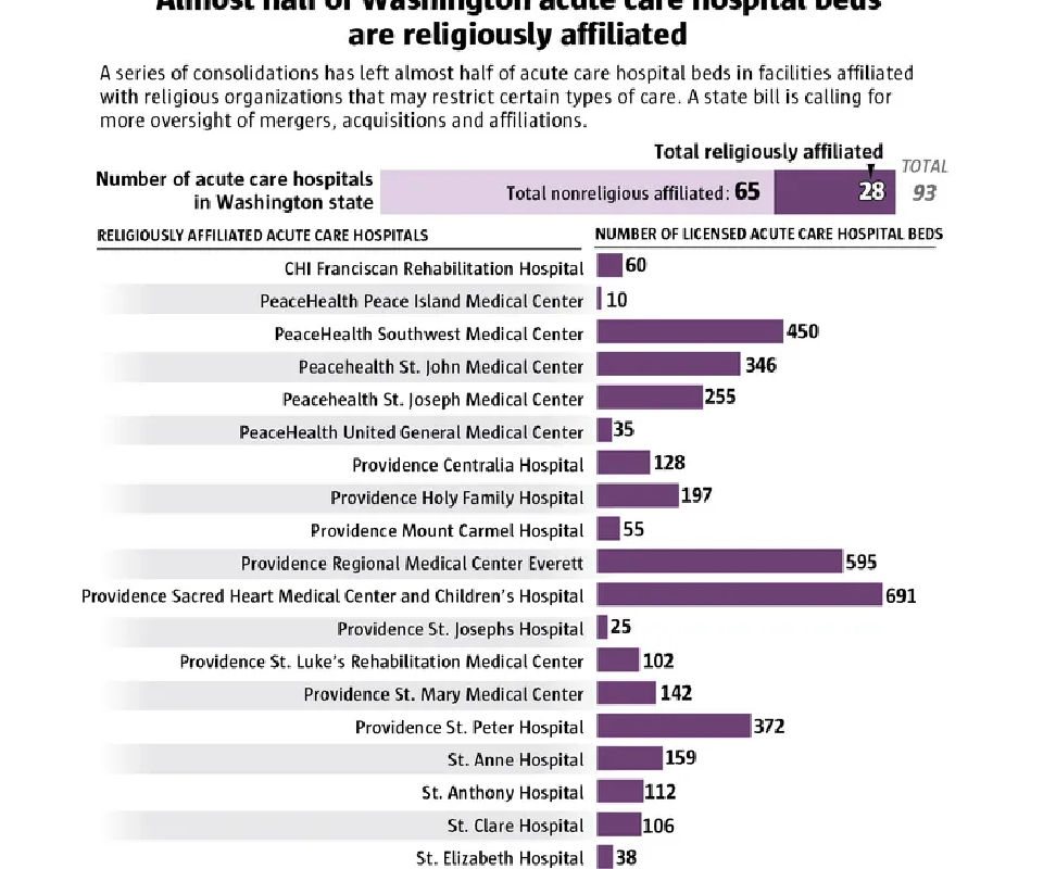 Washington has one of the highest rates of religiously affiliated hospitals in the U.S., with several counties lacking even one secular hospital, according to a 2021 analysis by the state Insurance Commissioner’s office.